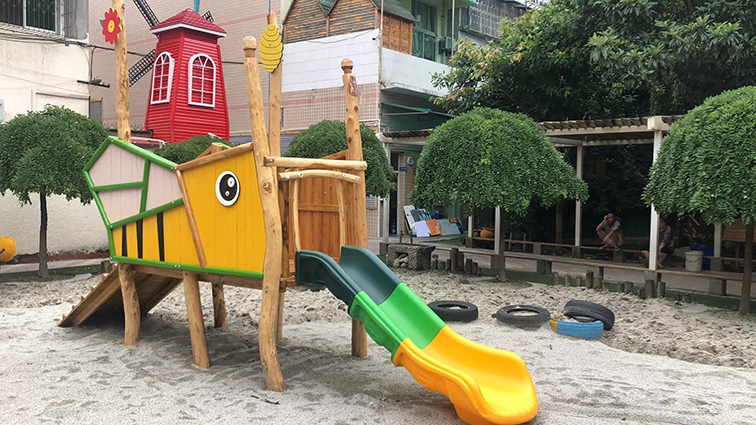设备集攀爬、滑行、钻行功能于一体:木质攀爬坡道可锻炼孩子的肢体力量,黄绿渐变滑梯带来顺滑的滑行体验,蜂巢造型的封闭空间则满足孩子的探索欲与安全感。它采用环保耐候的原木与塑胶材质,全圆角设计保障游玩安全,适配幼儿园、社区小型绿地等场景,既能让孩子在充满自然童趣的场景中释放活力,也能以萌趣的蜜蜂造型成为场地的童趣亮点。