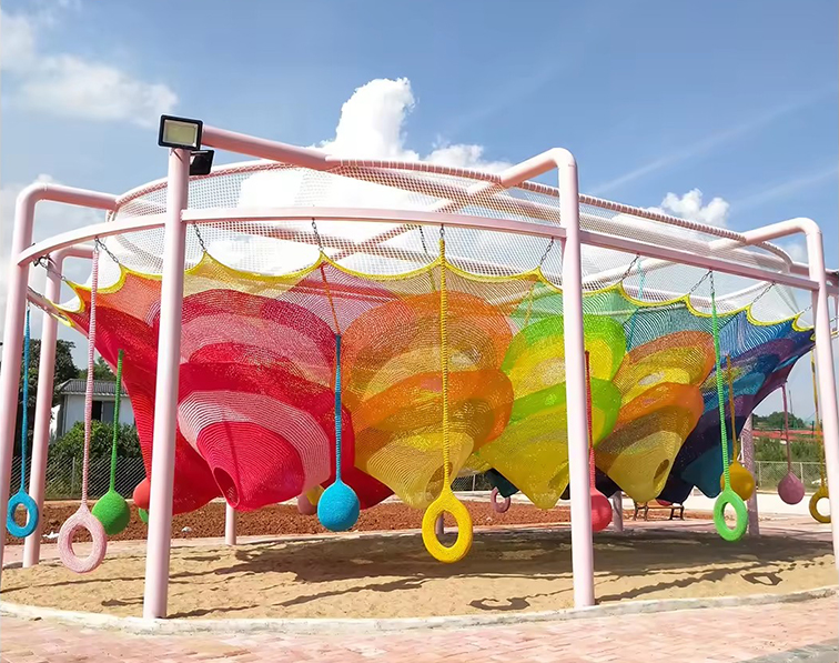 • 这是一款以彩虹渐变弹力网为核心的无动力户外游乐设备,粉白金属框架支撑起色彩缤纷的巨型网体,红、橙、黄、绿、蓝的渐变纹理如漂浮的彩色云朵,搭配悬挂的彩色圆环、吊球等互动装置,视觉上充满梦幻童趣。