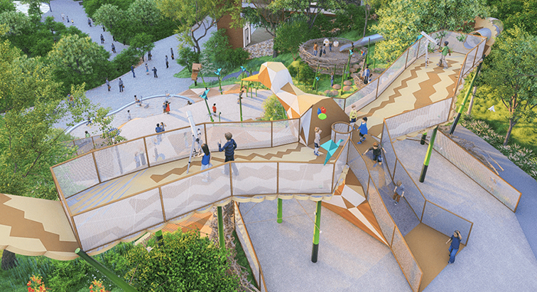 这是一款专为儿童打造的架空探险步道,以错落起伏的平台、网状防护栏与几何拼接的防滑面板为核心设计,整体造型如穿梭于林间的云阶,视觉上充满童趣与探索感,与周边绿植、广场自然融合。