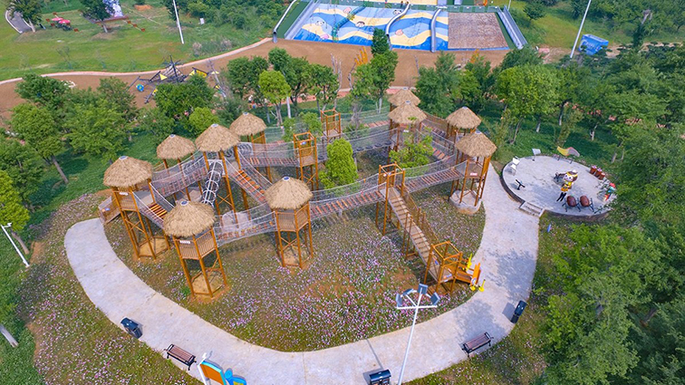 这是一款充满热带部落风情的室外无动力拓展游乐设备,以木质塔楼与茅草屋顶为核心设计,构建出蜿蜒交错的高空栈道与网阵,让游客在绿意盎然的环境中体验高空穿越的乐趣。主体采用环保防腐实木搭建支撑框架与栈道,搭配天然茅草屋顶与高强度防护网,既还原了部落的质朴质感,又保障了结构稳固与游玩安全。设备集高空行走、平衡挑战、亲子互动于一体,适用于城市公园、亲子景区、研学基地等场景,让孩子们在沉浸式的部落探险中锻炼平衡感、勇气与协作能力,同时感受自然与人文创意融合的独特魅力。