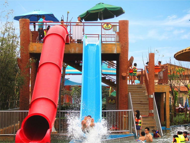这是一款主打双轨体验的水滑梯设备,以红、蓝撞色的双滑道为核心,搭配仿木质感的高架平台,视觉上充满活力与野趣,适配追求刺激的年轻游客与亲子家庭。