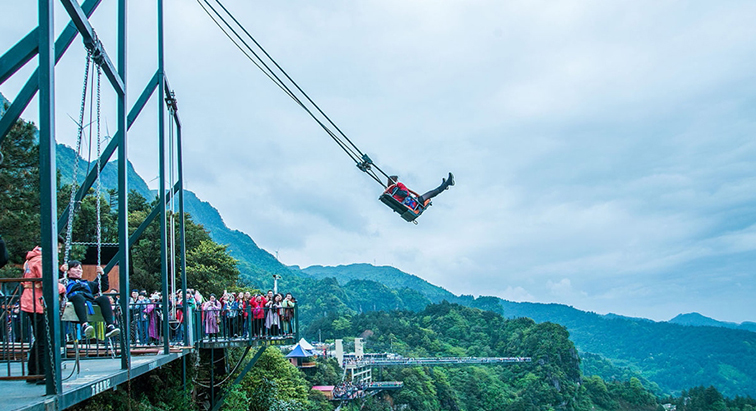 • 这是一款依托悬崖峡谷地貌打造的高空刺激类游乐设备,悬挂于数百米高的观景平台,以险峻的山林峡谷为背景,视觉冲击力极强。