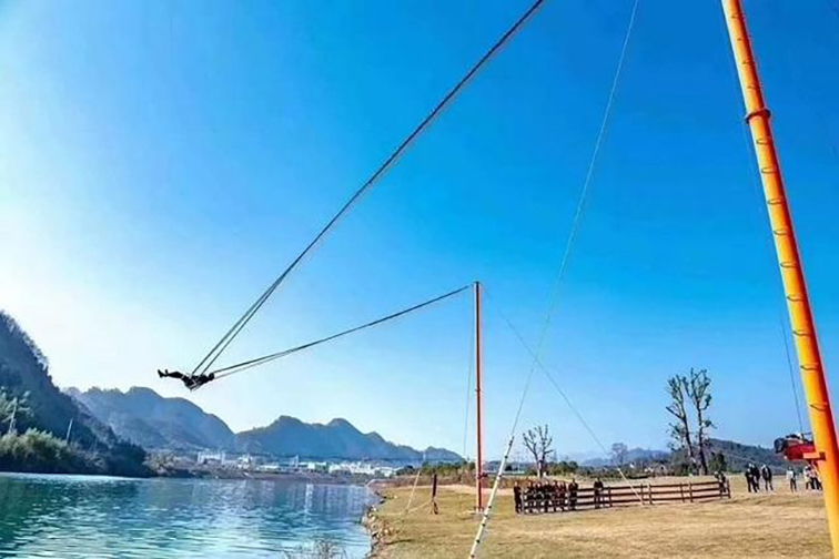 这是一款依托湖岸山水地貌打造的弹射蹦极设备,以橙红色高耸支架与弹力绳为核心,在澄澈湖面与层叠山峦的映衬下,视觉冲击力极强。游客穿戴专业安全装备后,通过机械装置蓄力弹射,可瞬间凌空飞掠湖面,体验失重俯冲与极速拉升的双重刺激,同时 360° 饱览湖光山色,实现 “刺激探险 + 观景打卡” 的双重体验。设备采用专业级弹力绳、五点式安全带与多重缓冲装置,搭配定期安全检测机制,全方位保障游玩安全。适合安置在滨湖景区、山水度假区、亲子营地等场景,既能作为网红打卡点吸引年轻探险爱好者与情侣客群,也能成为景区的标志性游乐项目,带动客流与话题传播。